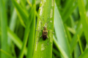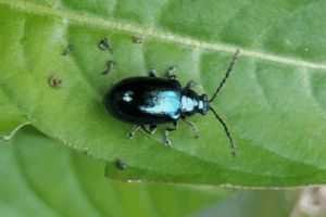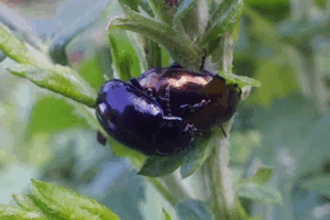 田んぼの草刈り中に出会ったキンイロネクイハムシ 田んぼに生えたミクリの葉を食べていました。金属のような光沢と、上翅の模様が特徴です。 他の写真