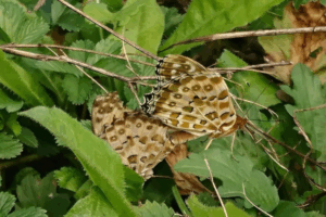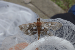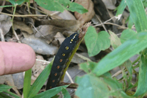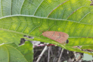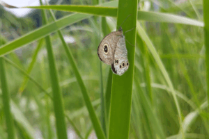田んぼの点検中に出会った個体 上の羽に大きく1つの斑点、下の羽に6つの斑点