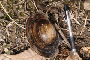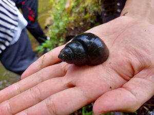 大学生たちと一緒にため池の生き物を探しました。岸に近い湖底で見つかったのがこの大きなタニシ 横にスジが見えることが特徴です。