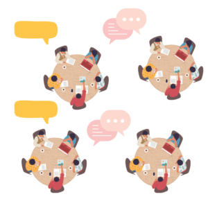 参加者が5~6名の小グループに分かれて設定されたテーマについて話し合い、最後に発表を行います。年代、性別、居住地に関わらず参加者が安心して発言できるように各グループに1名の進行サポート役を設けます。