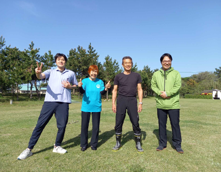 中海オープンウォータースイム実行委員会が大会を運営しています。大会長はNPO法人中海再生プロジェクト理事長の新田ひとみ(写真左から2番目)、副会長を鳥取県と島根県の水泳連盟の会長が担います。競技委員長は(一財)鳥取県水泳連盟の朝妻誠(写真左端)、副競技委員長は鳥取県トライアスロン協会の野嶋功(写真右から2番目)です。