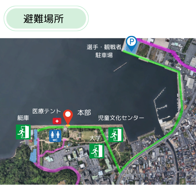 会場にお越しになる前に避難場所を確認してください。落雷の危険がある場合、災害が発生した場合は近くの建物に避難してください。医療テントは大会本部がある湊山公園東屋の付近に設けられます。