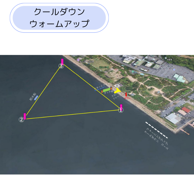 落雷等、気象条件の悪化によりレースを途中で中止する。場合は、ホーン・ホイッスルを短音で鳴らし選手に告知します。その後、選手は直ちに岸に向かって直線的に泳ぎ退避してください。