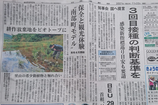 - 朝日新聞 矢田文(2021.2.17) 豊かな里山を守り伝える 南部町にビオトープを計画