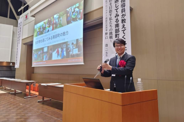 境高校の総合的な探究の時間「考境学」に講師として参加しました。地元で活躍する企業や団体が活動を紹介しました。当社は「南部町における生物多様性と環境への利活用」をテーマに高校生たちに講演を行いました。